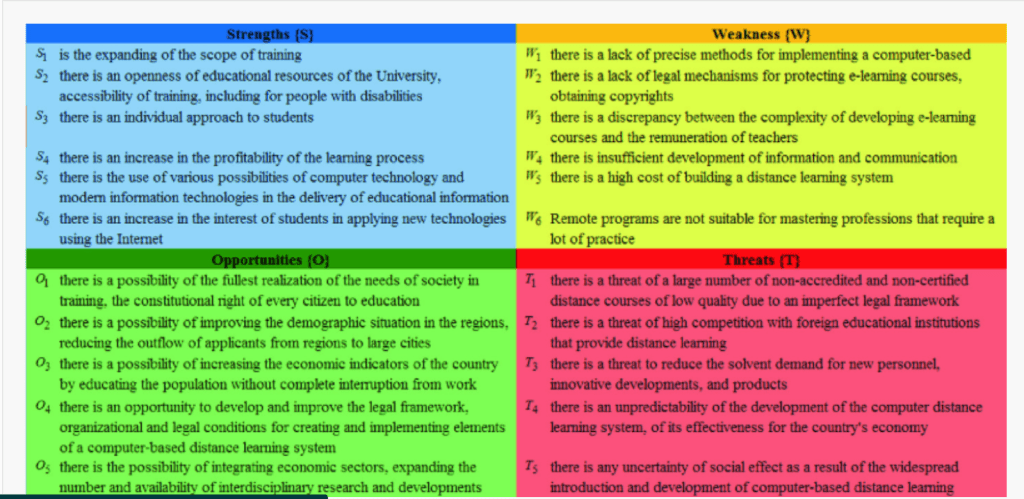 The issue of designing and integrating distance technology in the educational process is discussed in the conference paper. SWOT analysis is a method for gathering data and determining the best way to manage a computer-driven distance learning method based on statistical (Mutovkina, 2021).