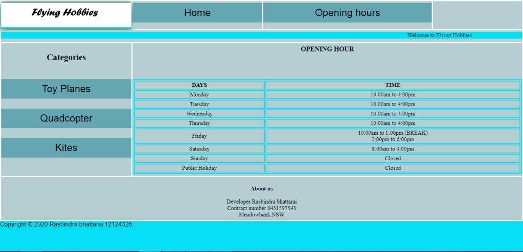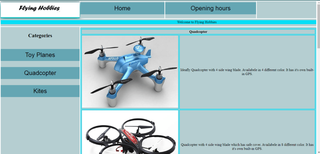 As of my assignment 1, I have developed a website with the title “Flying Hobbies”. The main goal of this website is to provide customers with details of products rather than buying or selling products.