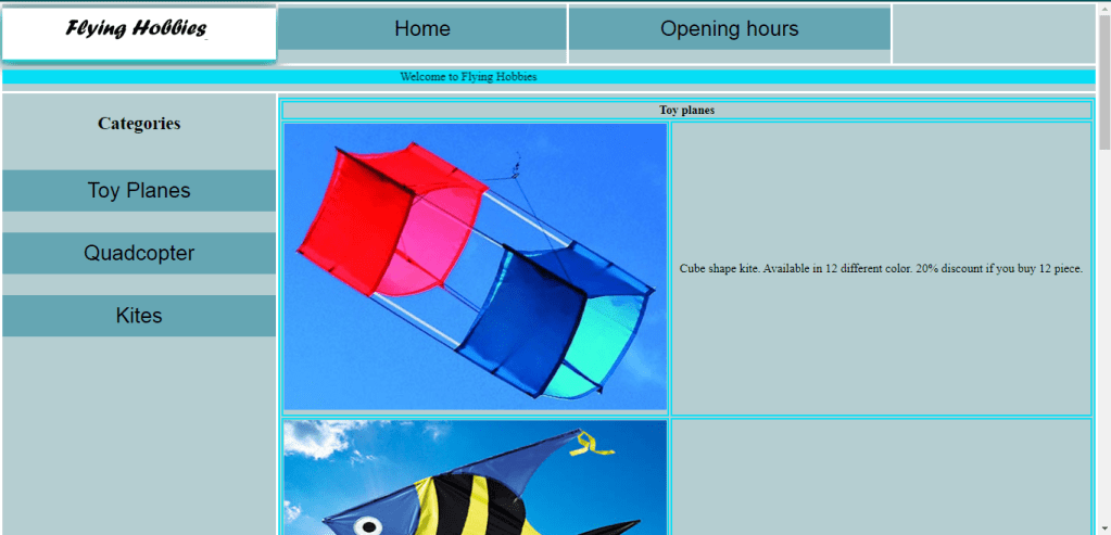 The file names which I will be using are index.html, kites.html, opening_hour.html, quadcopter.html, toy_planes.html, style.css.