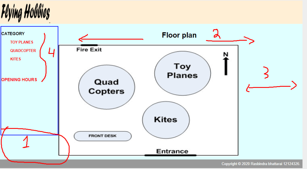 On this homepage, we can click on Home, Opening hours, Toy Planes, Quadcopter, Kites bottom including Logo too. All bottom are linked to particular pages. The main part of this page is that users can click on the floor map from where they can select categories.