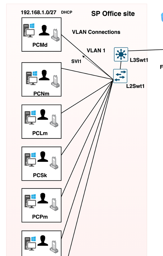 Layer 2 and layer 3, for the communication, the spanning over the tree will be applied. This will handle the MAC and reduce the need. For the SP network, the L3Swt1 will be the center switch. The virtual LANs use dedicated virtual switch interfaces for transferring information. The virtual switch interface plan will identify the shortest path to link the VLAN. The image below shows an example of a virtual switch interface to the individual VLAN.